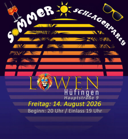 Wir feiern mit euch eine große Sommer-Schlagerparty im Eventlokal Löwen in Hüfingen. Kommt vorbei zum Tanzen, Mitsingen und Feiern bei coolen Getränken in toller Atmosphäre.